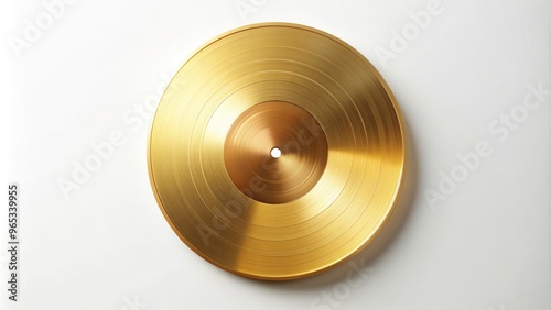 Realistic gold vinyl record on a white background creating a minimalist aesthetic, record player, turntable, audio, pop culture, technology, album, groove, vintage, minimalist, disc, vinyl