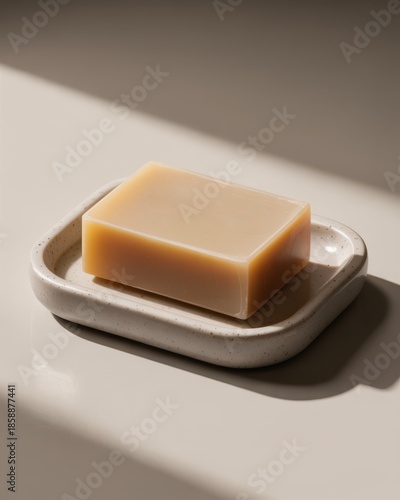 Rectangular beige soap bar placed on a simple ceramic soap dish on a light beige surface. Minimal still life with soft natural light, gentle shadows, and clean composition.
