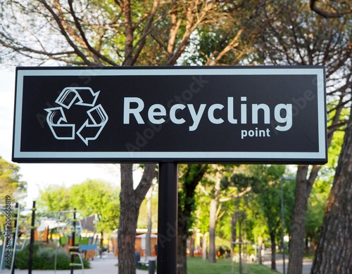 Recycling point sign ,words and symbol in white color on black background. Blurred public park on behind