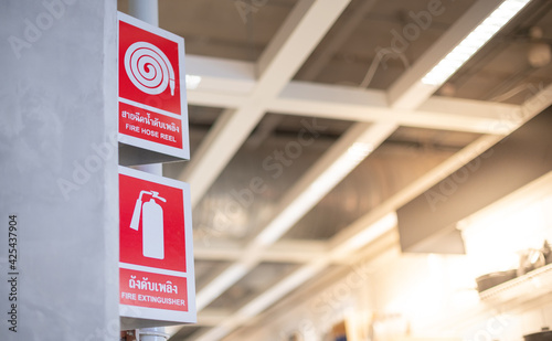 Red fire alarm sign on the white wall for safety first and sign for alert the fire being.