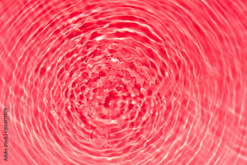 Red water bubbles on the surface ripples. Defocus blurred transparent pink colored clear calm water surface texture with splash and bubbles. Water waves with shining pattern texture background