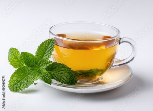 Refreshing Mint Tea in Glass Cup with Fresh Mint Leaves on White Background