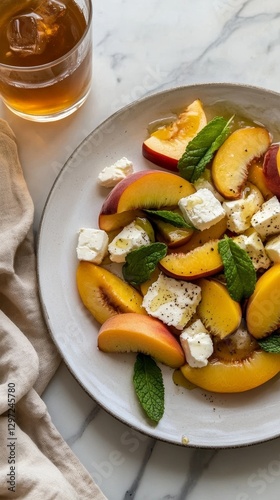 Refreshing summer salad with juicy peaches, feta, and fresh mint on a marble background
