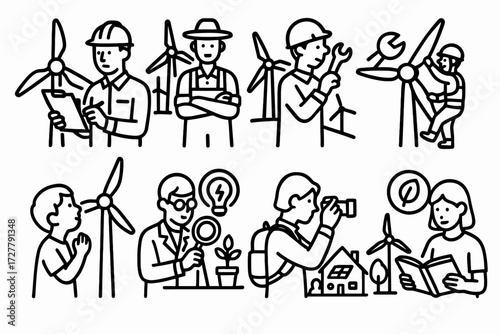 Renewable Energy Icons. Situations icons in outline style: engineer inspecting turbine, farmer near wind farm, child looking at blades, worker