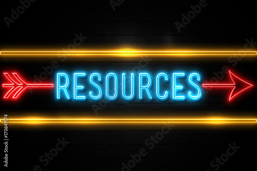 Resources - fluorescent Neon Sign on brickwall Front view