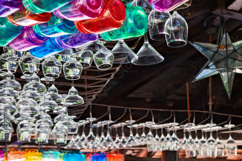 Restaurant interior background with narrow focus. Empty transparent wineglasses, rows of colorful beverage glasses hanging on top rack above bar counter. Vintage style wood ceiling.