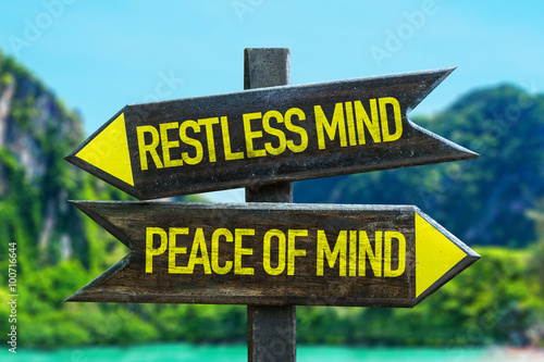 Restless Mind - Peace of Mind signpost in a beach background