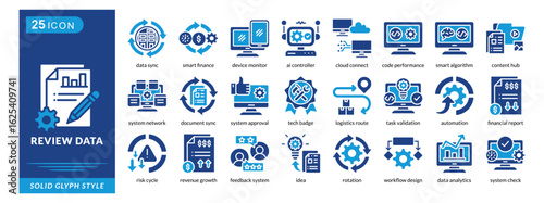 review data icon set collection in solid glyph style. an icon pack contain data sync, smart finance, device monitor, ai controller, cloud connect, code performance, smart algorithm, content hub
