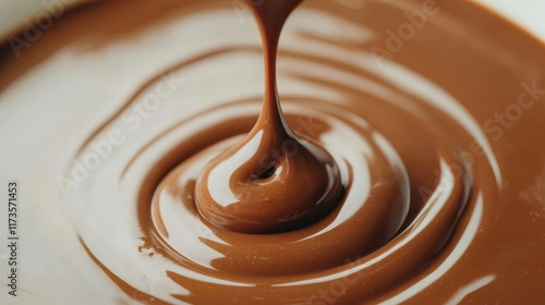Rich, smooth chocolate flows in a circular motion, showcasing its glossy texture and appealing color.