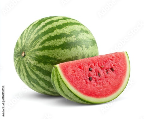 Ripe watermelon with green stripes and a slice with red flesh and dark seeds. Isolated on white backdrop. Refreshing and juicy summer fruit