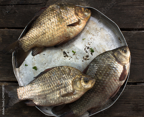 River raw fish - carp, in a round plateбFresh caught carp fish on wood.
