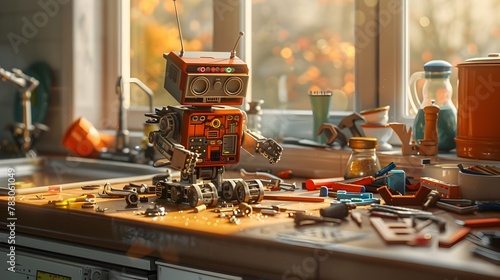 Robotic Diorama with Household Supplies on Kitchen Counter under Warm Morning Light