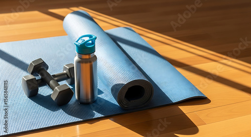 Rolled yoga mat, dumbbells, and water bottle rest on a hardwood floor, bathed in sunlight.