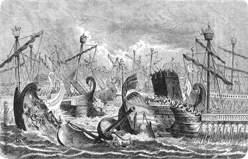 Roman warships ramming and sinking Carthaginian vessels during decisive naval battle at Aegates Islands, old vintage illustration, 1880.