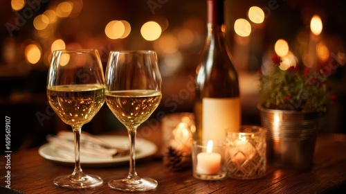 Romantic dinner setting with two glasses of white wine, a wine bottle, candles, and warm ambient lighting on a wooden table