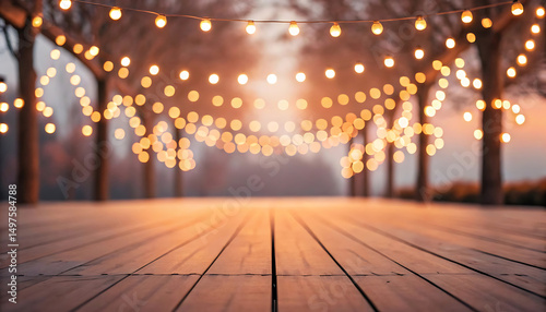 Romantic Evening Warm String Lights Illuminating Wooden Deck Path