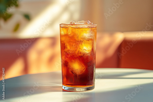 Rose Iced Tea drink in modern off-white minimalist trendy stylish vegan plant-based cafe bar setting with stucco concrete wall, product photography, outdoors, sunny, beverage, bright, shadow play