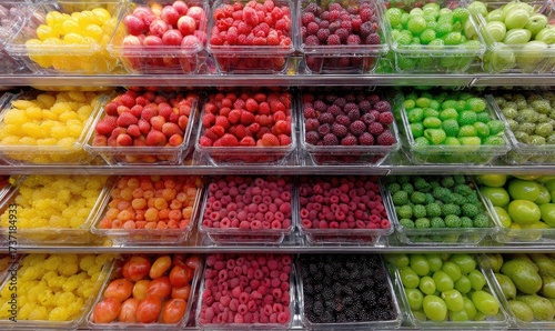 Rows of colorful pre-packaged fresh berries and fruits in clear plastic containers
