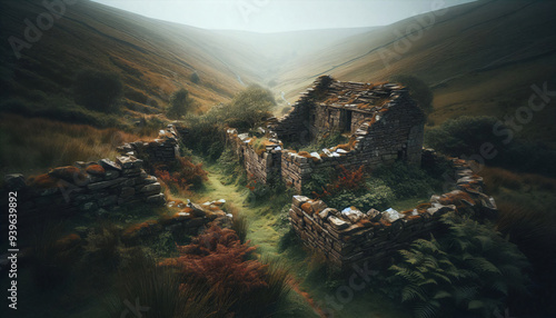 Ruined Stone Building Overgrown with Vegetation in a Misty Secluded Valley