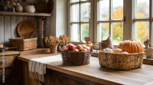 rustic kitchen interior in autumn, wooden textures, basket with apples and pumpkins, warm lighting, natural materials, cozy and nostalgic