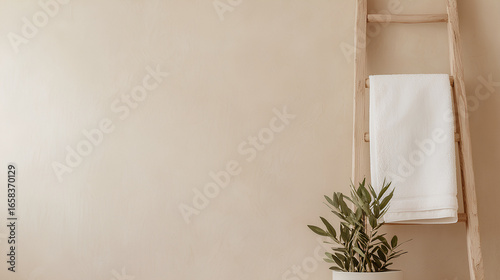 Rustic wooden ladder with white towels and potted plant against beige wall in minimal interior