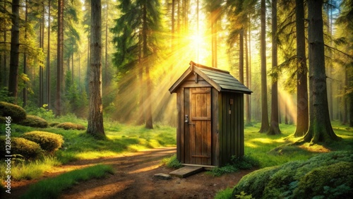 Rustic wooden outhouse stands solitary in the lonely, AI-imaged woodland.
