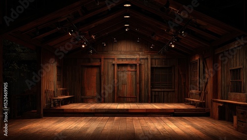Rustic wooden stage set, dimly lit, featuring a raised platform, three doors, and two simple benches