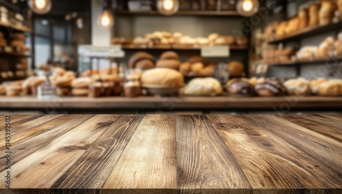 Rustic Wooden Tabletop with Blurred Bakery Background