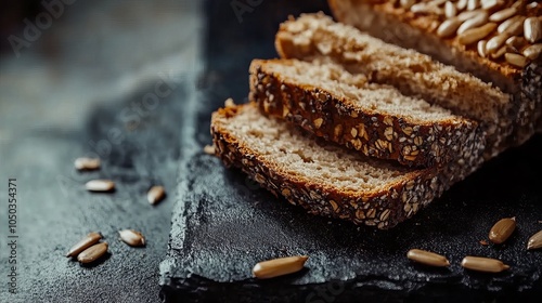 Rye flour bread with sunflower seeds, sliced on a black mica board on a dark background. High quality photo