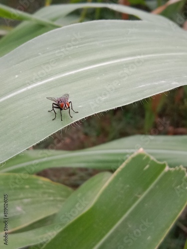 Sarcophaga carnaria on green leaf.Common Flesh Fly body pattern