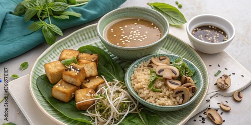 Savory and sweet Concept. Delicious Vegan Meal with Tofu, Couscous, Fresh Herbs, and Sesame Sauce on a Stylish Plate