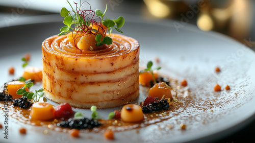 Savory mille-feuille with pumpkin, black caviar, and microgreens