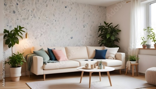 Scandinavian living room interior design zoom background,Doodle Galaxy patterned wallpaper graphics