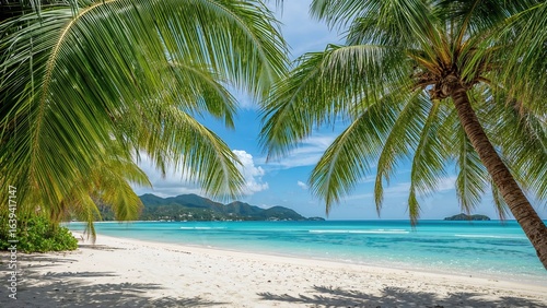 Scenic beach vista showcasing vibrant palm trees and pristine white sands.