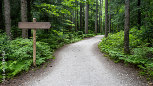 scenic hiking trail through lush green forest with signpost