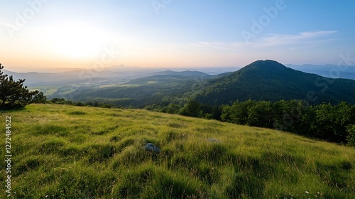 Scenic Panoramic View of Lush Green Hills and Majestic Mountains Under a Beautiful Sunset : Generative AI