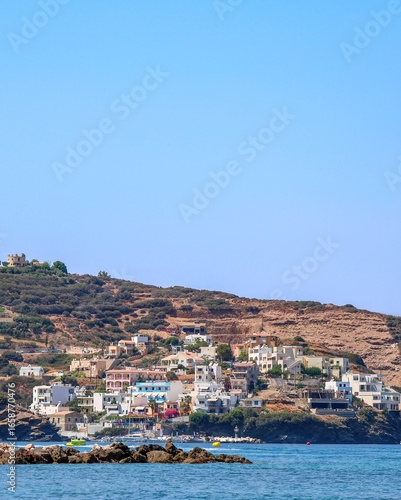 Scenic view of Bali, a coastal village near Rethymno in Crete, with hillside houses and turquoise Aegean waters, Greece, August 2025.
