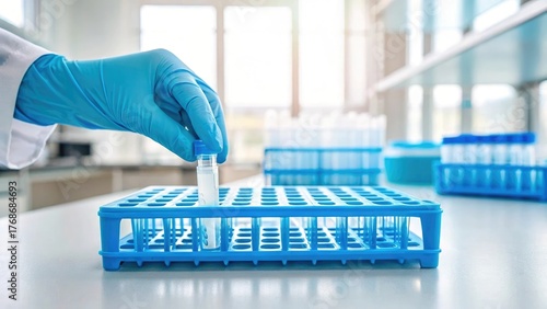 Scientist wearing blue gloves carefully places test tube in rack during laboratory research