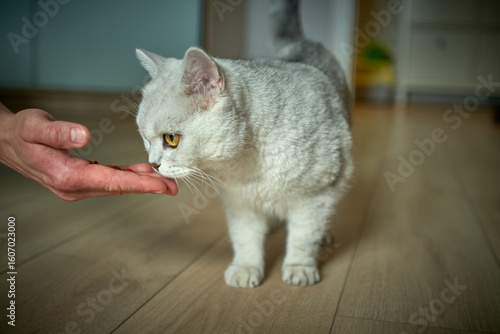 Scottish white cat stands in an apartment