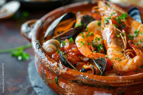 Seafood gazpacho soup.Gazpacho.Traditional Spanish soup.Close-up of a vibrant zarzuela seafood stew with mussels, shrimp, and clams in a rich tomato sauce, set in a rustic ceramic bowl