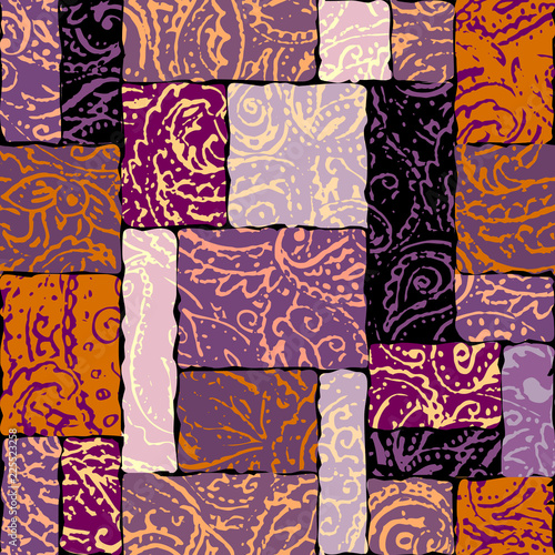 Seamless background pattern. Grunge paisley pattern in collage patchwork style. Ethnic indian style.