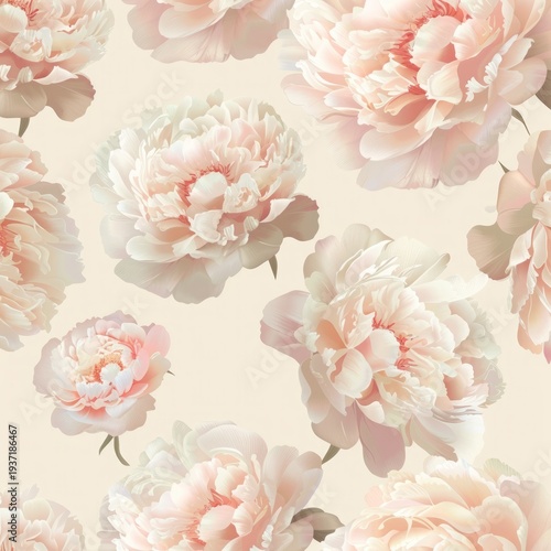 seamless pattern, peony flowers spaced evenly, neutral cream background, realistic soft style