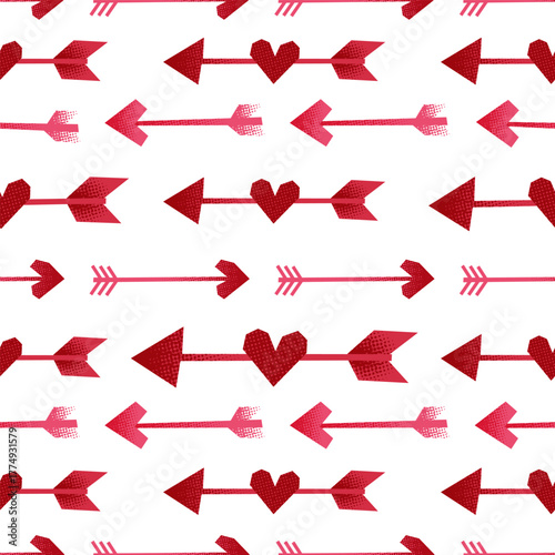 Seamless pattern with pink and red arrows shaped like hearts arranged in horizontal rows. Valentine’s Day design for wrapping paper, love cards, fabric prints, wedding decor, and scrapbooking
