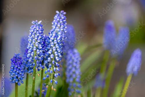 Selective focus of blue flowers Grape hyacinth (Druifhyacint) in the garden, Muscari is a genus of perennial bulbous plants, Common name for the genus is grape hyacinth, Nature floral background.