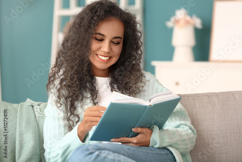 Senior African-American woman reading book on sofa at home. Process of aging