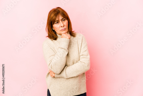 Senior caucasian woman isolated suspicious, uncertain, examining you.