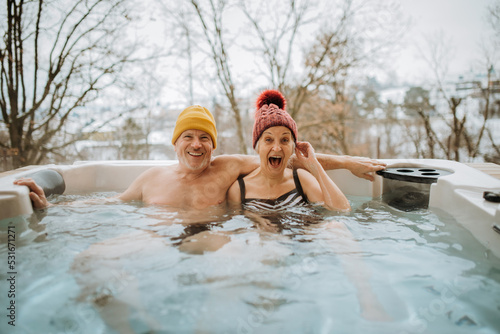 Senior couple in kintted cap enjoying together outdoor bathtub at their terrace during cold winter day.