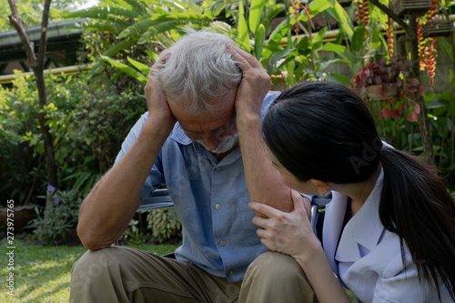 senior man upset sitting on wheelchair with nurse, takes care and discussion and cheer in the garden at nursing home