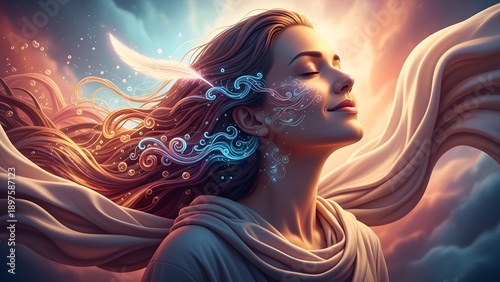 Serene ethereal woman experiencing spiritual awakening with glowing energy flowing through her long hair and delicate facial markings.