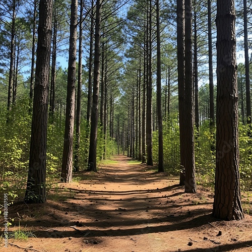 Serene forest path surrounded by tall trees.